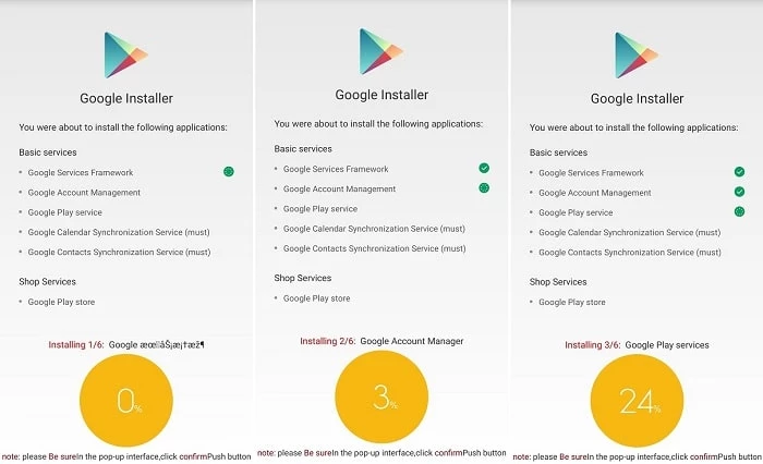 Google Installer membuat pengaturan untuk Google Framework yang merupakan fondasi dasar untuk Google Apps. Sebaiknya instal Google Play Store secara manual jika tidak muncul setelah instalasi.
